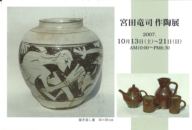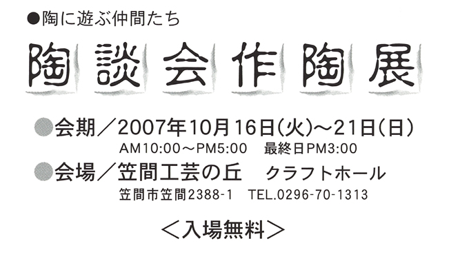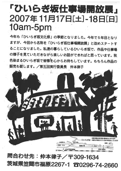 「ひいらぎ坂仕事場開放展」 2007年11月17日[土]-18日[日] 10am-5pm 仲本律子・・・陶器 今野春雄・美登里・・・陶器 佐藤泰正・洋子・・・陶器・染色 猪本拓・さやか・・・陶彫・陶器 「ひいらぎ坂文化祭」は「ひいらぎ坂仕事場開放展」と改名し新たにスタートしました。 普段見ることのできない陶芸家の仕事場の様子が一般に開放されるというおもしろい企画です。ぜひ足をお運びください。 問合せ先:仲本律子/〒309-1634 茨城県笠間市福原2267-1 ℡0296-74-2660